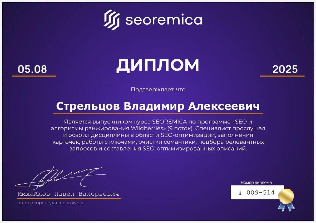 Официально — выпускник SEOREMICA 9 Получил диплом и кучу практических знаний по SEO-оптимизации на Wildberries. Структурировал всё, что знал раньше, и усилил это свежими инструментами и подходами.