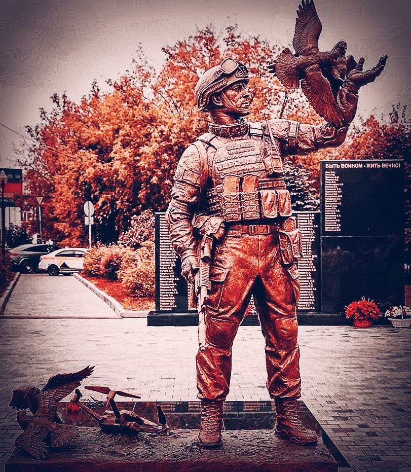 Памятник бойцу СВО открыли в подмосковном городе Орехово-Зуево. На руке русского воина голуби. Под ногами сбитый вражеский дрон. Смысл понятен: голубь - символ мира, наши очищают родное мирное небо от нацистской нечисти. Скульптура подготовлена Студией военной живописи им. Грекова.
