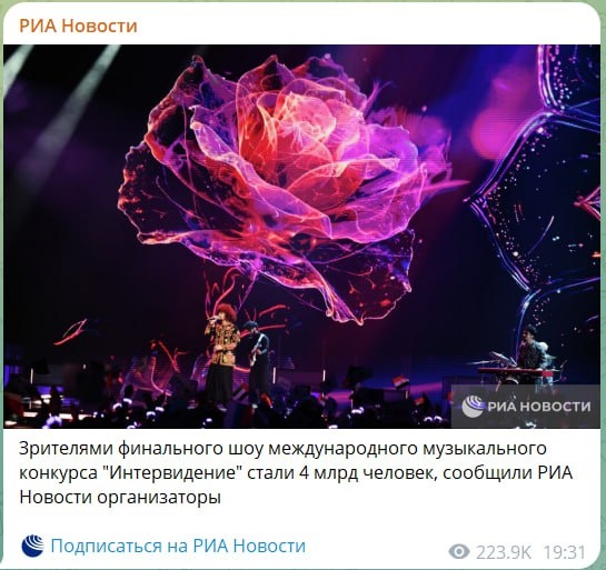 РИА Новости не ко времени выдали какой-то очень смешной, но, к сожалению, очень короткий текст про то, что тн Интервидение 2025 посмотрели 4