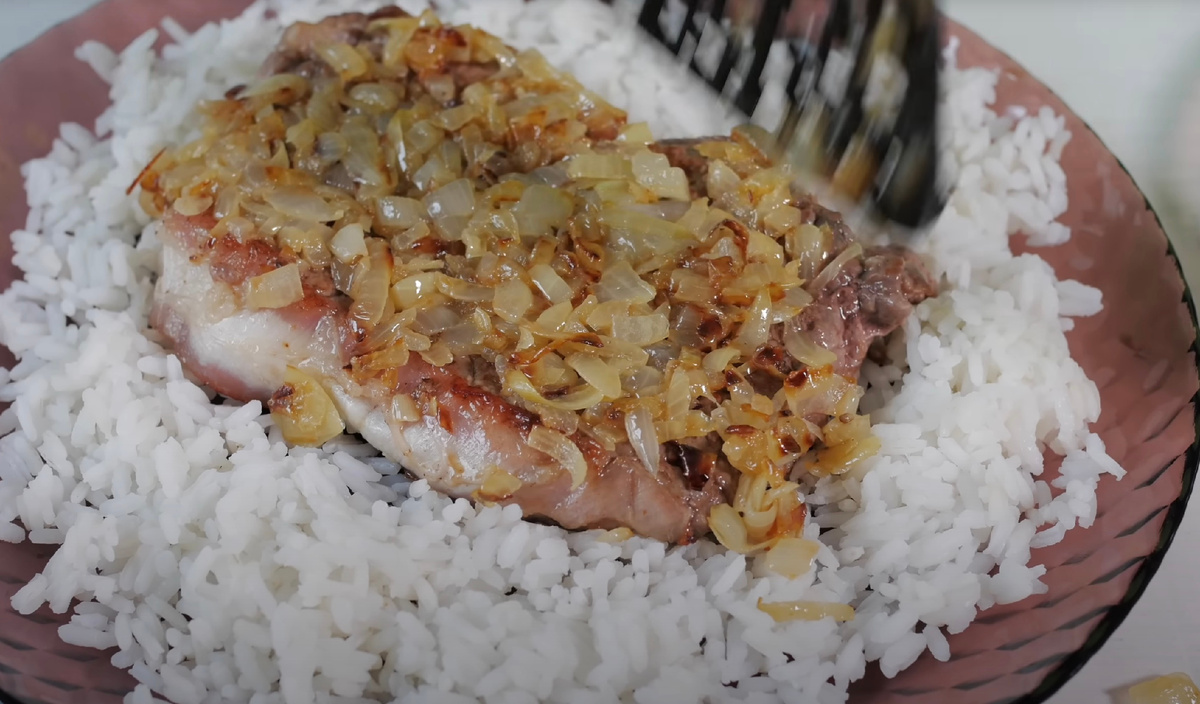 - Подавайте на тарелке с рисом, выложив сверху стейк. Рядом разложите карамелизированный лук. Полейте мясо соком, который выделился во время отдыха в фольге. Украсьте свежей зеленью.