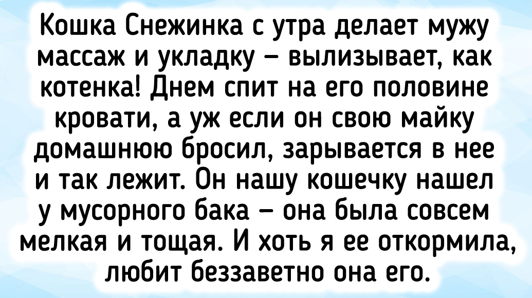 - Кошка Снежинка с утра делает мужу массаж и укладку — вылизывает, как котенка! Днем спит на его половине кровати, а уж если он свою майку домашнюю бросил, зарывается в нее и так лежит. Он нашу кошечку нашел у мусорного бака — она была совсем мелкая и тощая. И хоть я ее откормила, любит беззаветно она его. © Oksana Roman / ADME