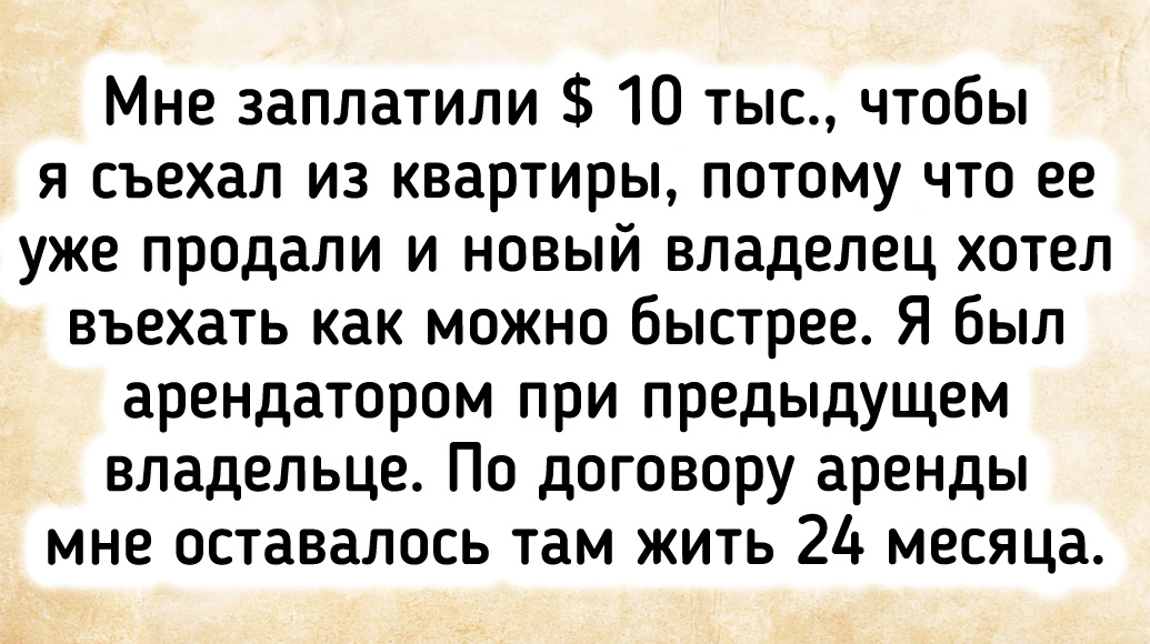 - Мне заплатили $ 10 тыс., чтобы я съехал из квартиры, потому что ее уже продали и новый владелец хотел въехать как можно быстрее. Я был арендатором при предыдущем владельце. По договору аренды мне оставалось там жить 24 месяца. © Mental-Restaurant-47