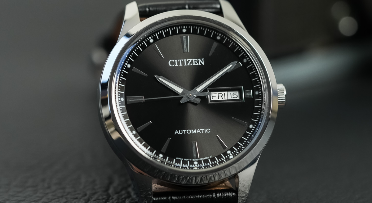 Для начала мы выбрали Citizen Mechanical Day/Date NY4058, который стоит всего 219 евро! За эти деньги вы получаете стильные часы с деловым оттенком и собственным автоматическим механизмом. Нам больше всего нравится чёрная модель с кожаным ремешком — она идеально подходит для офиса. Циферблат аккуратно отделан и показывает не только время, но и день недели с датой. Запас хода механизма составляет до 42 часов, что вполне приемлемо.