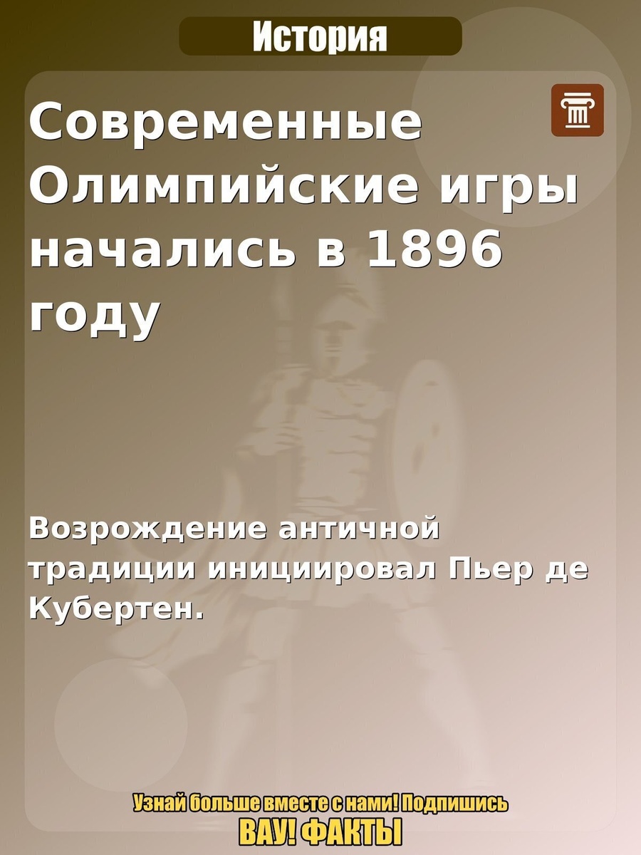 Современные Олимпийские игры начались в 1896 году. Возрождение античной традиции инициировал Пьер де Кубертен. Интересный факт по теме «История»: Современные Олимпийские игры начались в 1896 году. Почему так: Возрождение античной традиции инициировал Пьер де Кубертен.. Поделитесь в комментариях, знали ли вы об этом и стоит ли делать продолжение по теме. #история #факты #удивительно