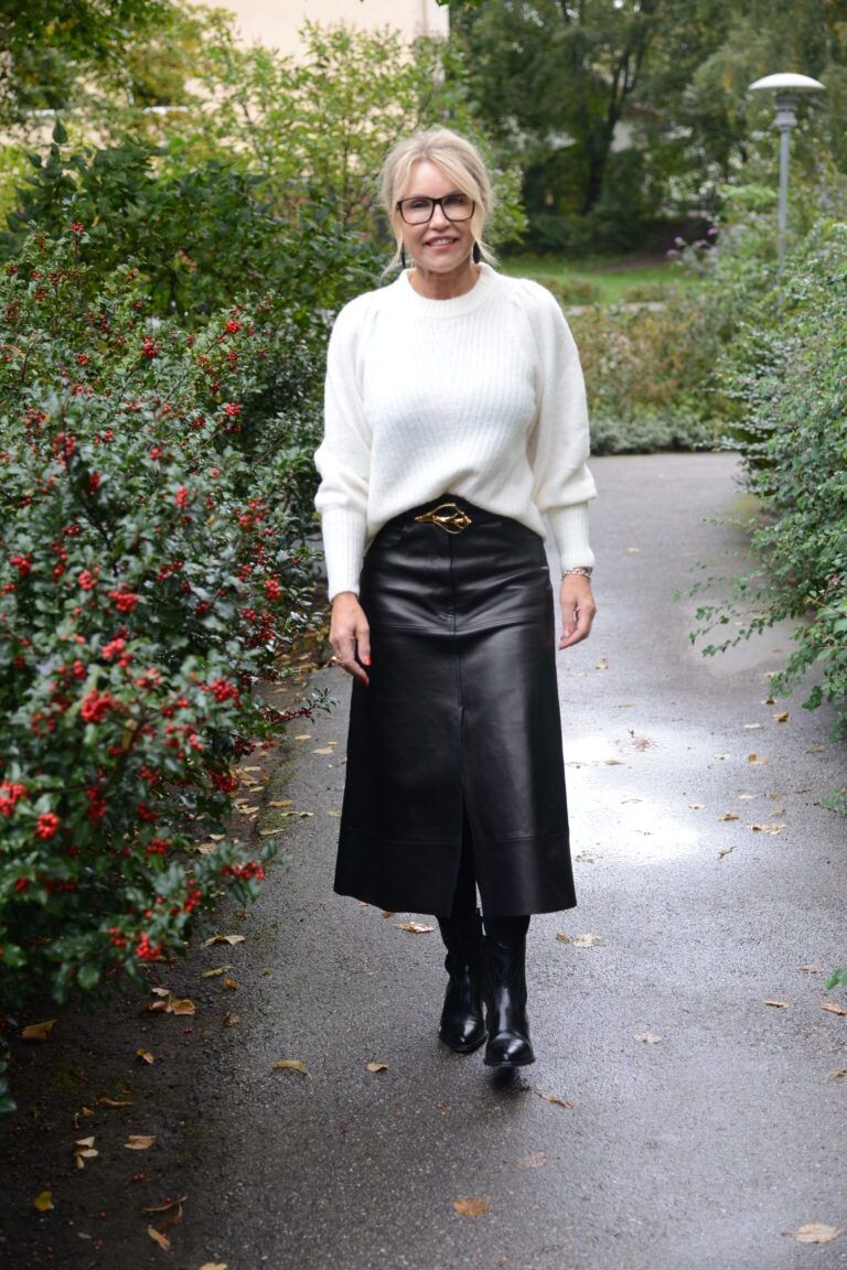 Искусственная кожа в современном мире моды – это материал, которые не только успешно заменяет кожу натуральную, но и имеет в сравнении с ней массу преимуществ. Искусственная кожа более гибкая и податливая, ее легко использовать в шитье, она устойчива к истиранию, долго сохраняет прочность и привлекательный внешний вид. Этот материал представляет собой текстильную основу с нанесенной сверху полиуретановой пеной, следовательно, его использование не наносит вреда природе, и именно поэтому кожзам активно используется знаменитыми модными брендами по всему миру. Этой осенью вещи из искусственной кожи пользуются максимальной популярностью – в ней зрелые дамы будут выглядеть стильно и эффектно. 1. Черная кожаная юбка-трапеция длиной ниже коленей и с небольшим разрезом по центральному шву, объединенная в ансамбль с мягким белым джемпером, с частично заправленной за пояс передней частью – оригинальный взгляд на черно-белую классику. Этот осенний образ выглядит очень привлекательно, женственно и