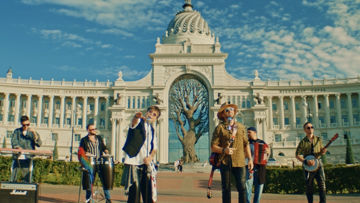 Снимать решили в Казани. И это гениальный выбор. Город, где Европа и Восток переплетаются так, что ни одно здание не кажется случайным. С одной стороны — купола и фасады, с другой — минареты, аромат кофе и чак-чака. Волга течёт фоном, будто в клипе снимается не река, а сама история.