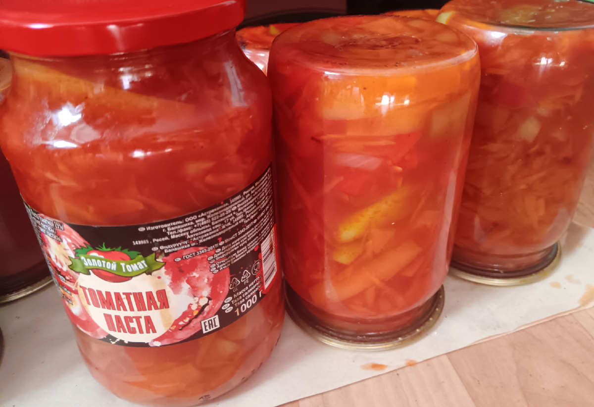 Однако, овощи у меня уже были нарезаны (перец и лук), морковь натерта, что делать, не ехать же срочно за другой томатной пастой. Хоть и не лежала душа, но приготовила с той, что была. Так то не скажу, что плохо получилось, даже довольно вкусно, но это если не сравнивать с предыдущей партией. Ниже на фото банка от той некачественной пасты, "Золотой томат" марка.