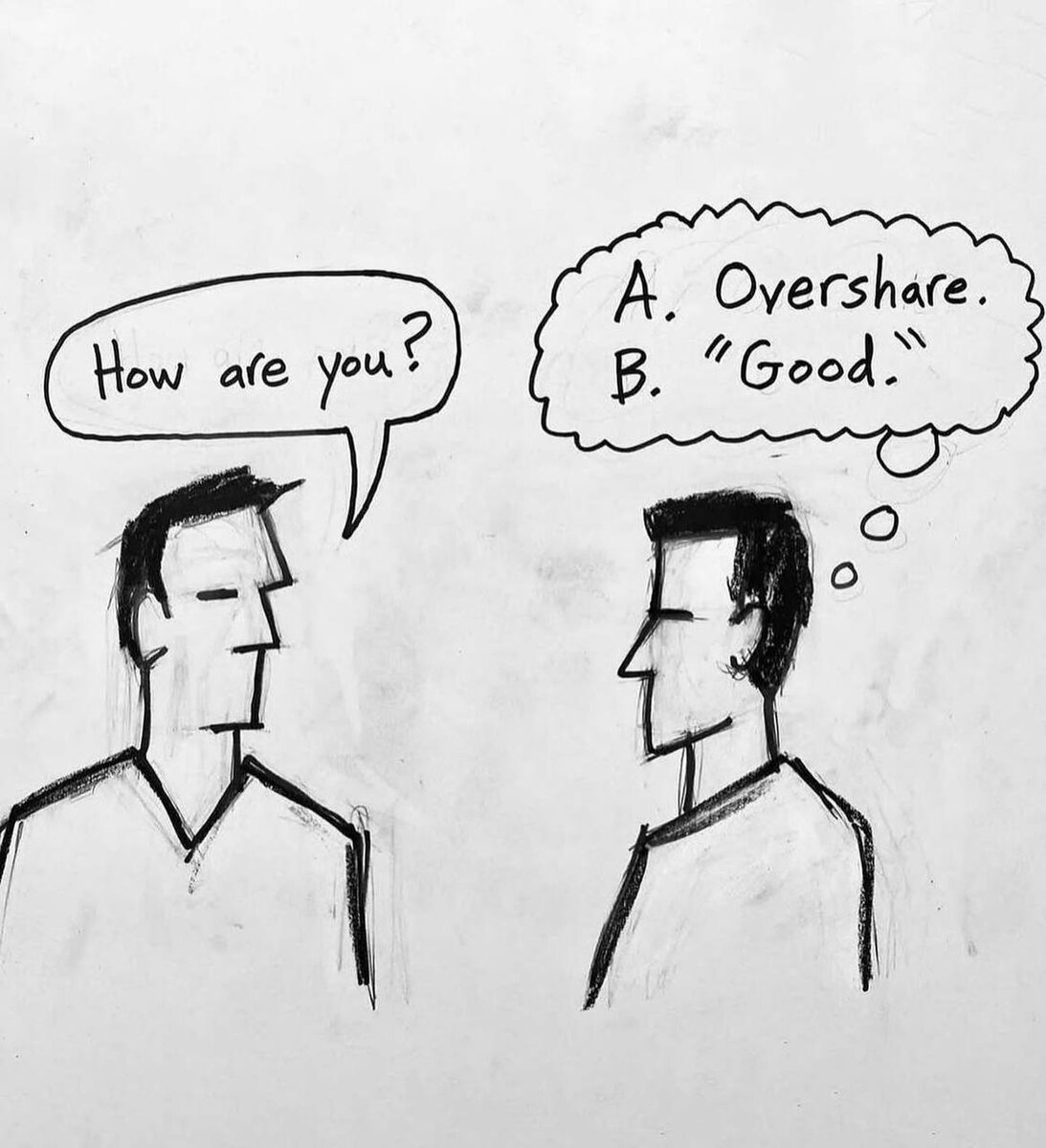 David Finch и его идея 💠 Дэвид Финч работает с тем, что мы обычно не проговариваем. Его иллюстрации — это не про форму, а про смысл: короткие сцены из повседневности, где скрываются внутренние сомнения, неуверенность, стремление к диалогу. Он показывает, что искусство может быть инструментом честного разговора о простом. Главная сила его подхода — в минимализме. Простые линии, схематичные фигуры и текст без украшений позволяют сосредоточиться не на красоте рисунка, а на эмоции, которая за ним стоит. В его работах нет лишнего, но именно это делает их узнаваемыми: зритель достраивает историю сам. ✏️ Финч превращает банальные ситуации в искусство. В них нет пафоса, зато есть подлинность. Его работы напоминают, что каждый жест, ошибка или пауза в разговоре — это уже готовая история. И именно это сближает его рисунки с людьми: они не про «высокое искусство», а про жизнь такой, какой она есть. #искусство #идеи 😀 Звучи в унисон!