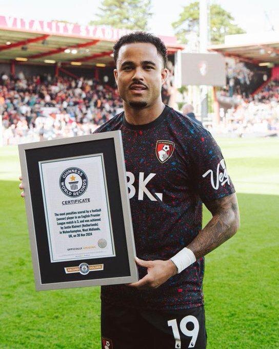 Джастину Клюйверту из "Борнмута" был вручен сертификат о включении в Книгу рекордов Гиннесса за три гола с пенальти в матче Премьер-Лиги. Это случилось 30 ноября 2024, когда "вишенки" победили "Вулверхэмптон" со счетом 4:2 🤌