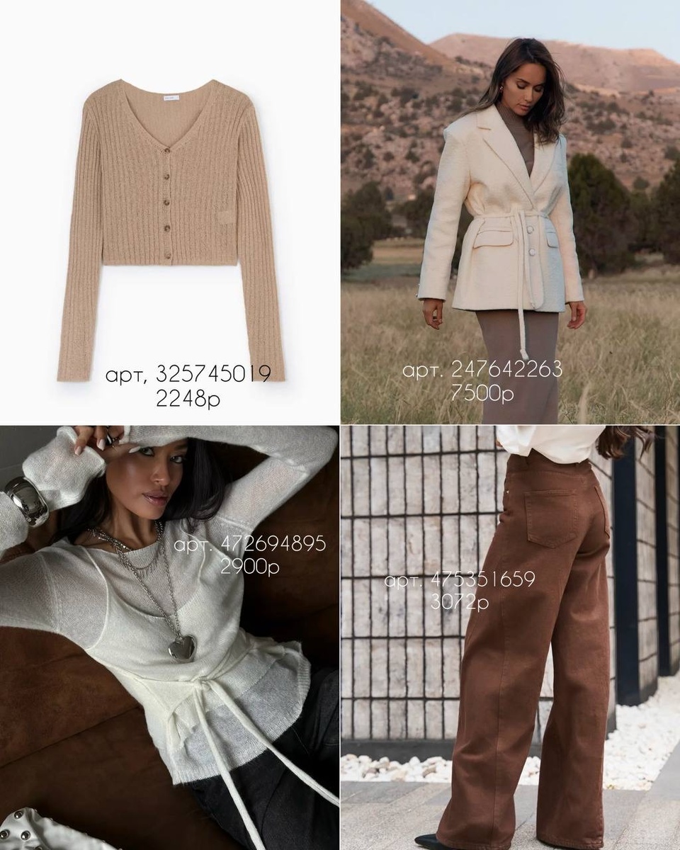 Миксуем «сливочную» палитру, шоколадные акценты и правильные базовые формы — получается капсула, которая вытянет и офисный будень, и свидание, и выходные. Ниже — подробный разбор каждой вещи из подборки на фото. Идём строго по порядку, называя артикулы, чтобы вы легко нашли именно те модели.