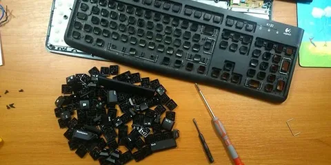 Как почистить клавиатуру своими руками. Клавиатура как и другие технические устройства компьютера нуждается в регулярном обслуживании. В основном это обслуживание заключается в очистке поверхностей клавиатуры от пыли и других загрязнений (крошки пищи, пролитое кофе и чай и др). А так как у клавиатуры очень сложная поверхность, множество различной величины кнопок и индикаторов, чистка клавиатуры займёт довольно много времени и сил. И так клавиатуру можно почистить без разборки снаружи или полностью разобрав, что будет намного сложнее сделать но зато очистка будет более качественной. Рассмотрим оба варианта. Перед тем как почистить клавиатуру первым делом отключите компьютер от сети и отсоедините разъём клавиатуры от компьютера. Не разбирая клавиатуру можно почистить так. Продуйте клавиатуру воздухом из баллончика или пропылесосьте пылесосом с самой узкой насадкой и протрите влажной салфеткой или тряпочкой смоченной в мыльном расстворе а затем сухой тряпочкой. Чтобы почистить клавиатуру