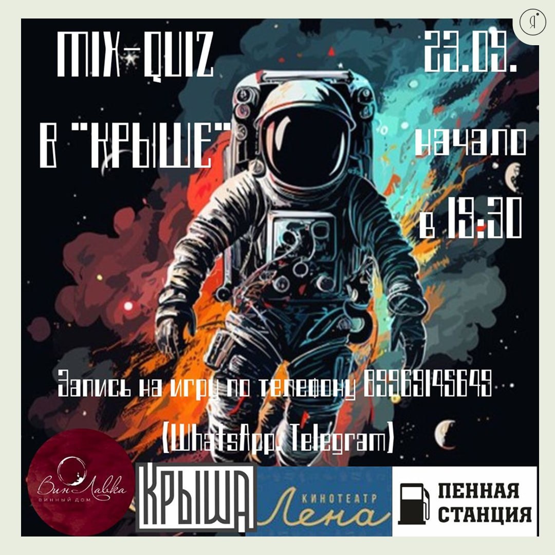 MIX-QUIZ #Концерты Играют команды от 2-х человек Любите музыку? Обожаете кино? Знаете ответы на самые неожиданные вопросы? Тогда вам точно к нам! Вас ждёт: 🤩 Три захватывающих тура и 90 вопросов из разных областей знаний. 🤩 Два часа драйва, азарта и отличного настроения в кругу друзей! 🤩 Призы и подарки победителям 23 сентября | 19:30 Крыша, Кальвица, 14/1а 500 руб. с участника +79969145649 Online Якутия | Подписаться