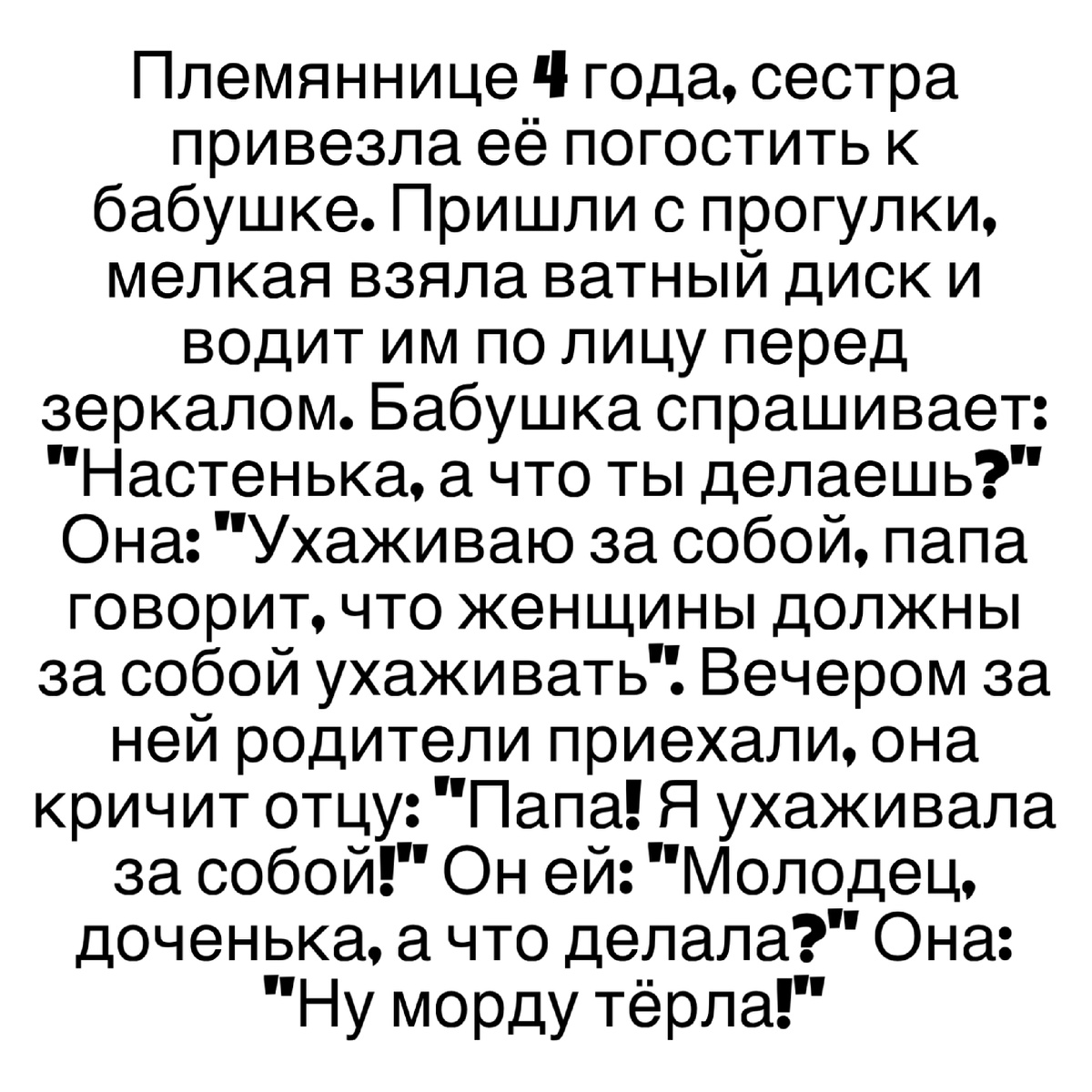 Племяннице 4 года, сестра привезла её погостить к бабушке. Пришли с прогулки, мелкая взяла ватный диск и водит им по лицу перед зеркалом. Бабушка спрашивает: "Настенька, а что ты делаешь?" Она: "Ухаживаю за собой, папа говорит, что женщины должны за собой ухаживать". Вечером за ней родители приехали, она кричит отцу: "Папа! Я ухаживала за собой!" Он ей: "Молодец, доченька, а что делала?" Она: "Ну морду тёрла!"