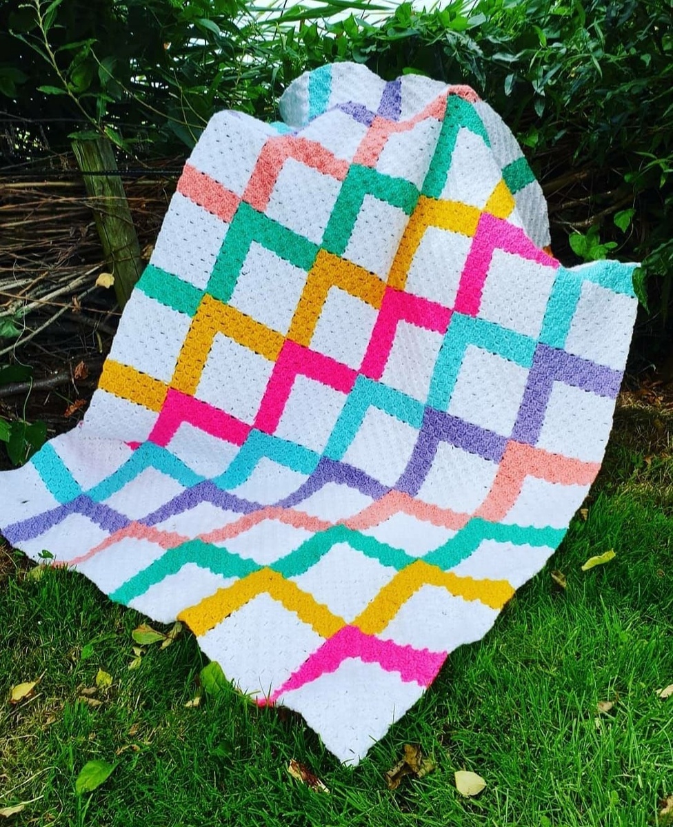 В ходе поиска чего-то интересного, связанного крючком в технике С2С я нахожу немало фотографий для вдохновения, по которым не так легко найти первоисточник или же схему, по которой вязали конкретное изделие. В этом случае спасает простой подсчет клеток на том же самом пледе, если рисунок довольно простой. Так случилось и с этим пледом. Его фотография понравилась не только мне ,а потому появились запросы на поиск схемы для этого пледа. К сожалению, поиски схемы ничего не дали, а потому я решила на скорую руку в приложении для рисования схем в технике С2С сделать схему пледа по готовому изделию. Времени ушло не много, схема оказалась максимально простая. Особенность ее еще заключается в том, что по этой схеме можно вязать как в привычной технике вязания крючком из угла в угол (вязание С2С по диагонали), а можно вязать блоками в этой же технике, чтобы избежать изобилия клубочков пряжи во время вязания пледа. Подробнее про узор С2С можно посмотреть в видео мастер-классе по вязанию данного