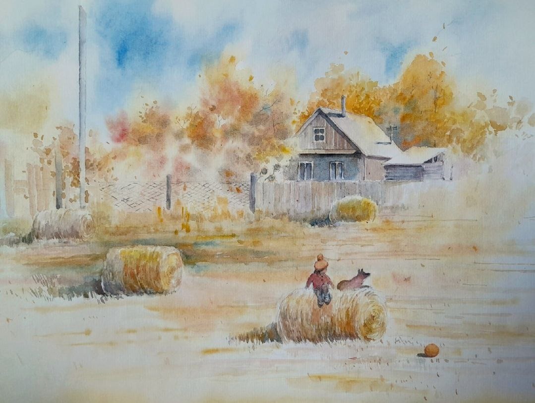 #поэтическоеутро ПАДАЮТ ЛИСТЬЯ... Падают листья, тихонько кружась, Падают листья, за воздух держась. Падают медленно без остановки И без указанной небом парковки. Без суеты и совсем не игриво. Скромно, сентябрьски и неторопливо... Галина Свириденко Акварель Айару Ивановой. Отчий дом (найдено на dzen.ru) #литературагорногоалтая #живописьгорногоалтая
