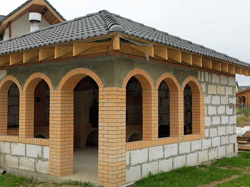 Я еще хотел сказать, что следует обратить внимание на то, что под той аркой для камина выложен первый ряд кирпичей и выложен он дугой. Так удобнее! Места перед казаном больше, а проход между углами кухонных устройств и мебели - шире. Позади первой дуги будет располагаться вторая, с мангалом и двумя столами рядом. Проход между мангалом и казаном-камином-плитой будет вести к большой газовой плите, которая встанет у правой стенки. Слева от нее стол, потом раковина для чистки-мойки овощей и кореньев, справа от нее еще стол и потом холодильники. Над всей этой линией шкафы, антресоли - барахла-то много!