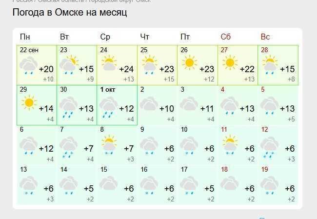 Тёплая финальная неделя сентября сменится прохладным и дождливым началом октября, а с 7 октября в прогнозе появляются первые снегопады. Об этом свидетельствуют данные сервиса Gismeteo. На этой неделе с 22 по 27 сентября в городе ещё будет царить бабье лето: днём до +20…+24 градусов, много солнца, кратковременные дожди возможны в начале периода. С 28 сентября начнётся похолодание, местами будут идти дожди. Температура опустится до +13…+15 градусов. С 1 октября будет стабильно прохладно — около +10…+12 градусов, пасмурно и дождливо. С 7 октября в прогнозе появляются мокрый снег при дневных температурах около +6 градусов и ночных около нуля. Осадки ожидаются волнами на протяжении второй недели октября. Читайте также на портале Om1.ru Прощаемся с бабьим летом: на Омск надвигается активный циклон с дождями и ветром
