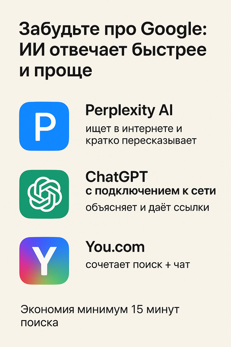 --- Сколько раз бывало: зашли в Google с простым вопросом, а в итоге 15 минут листаем сайты, ловим рекламу и теряем время? Теперь это в прошлом. Современные ИИ-сервисы умеют искать и объяснять гораздо быстрее — в формате готового ответа. --- ### 🔎 Perplexity AI Это ваш умный навигатор по интернету. Он не просто ищет, а сам читает десятки источников и выдаёт краткий пересказ с ссылками. **Пример:** спрашиваете «лучшие книги по тайм-менеджменту» — и уже через секунду получаете список с описанием и прямыми ссылками на магазины. --- ### 💬 ChatGPT с доступом к сети Классический помощник, но с возможностью поиска в реальном времени. Объяснит сложную тему простыми словами, добавит источники и даже предложит пошаговое решение. Это как друг, который не только «знает», но и умеет разжевать. --- ### 🌐 You.com Гибрид поисковика и чата. С одной стороны, привычный поиск по сайтам, с другой — возможность тут же уточнить детали в диалоге. Удобно, если нужно быстро уточнять, докручивать