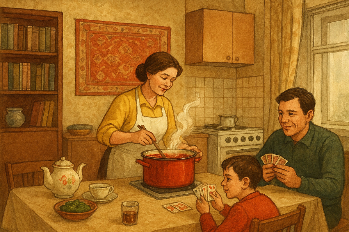 📎 В праздничные дни — оливье, селёдка под шубой и пироги. В кухне всегда пахло жизнью. Там собирались, разговаривали, пили чай с вареньем. И даже скромный ужин наполнял дом уютом. Уборка была отдельной историей.