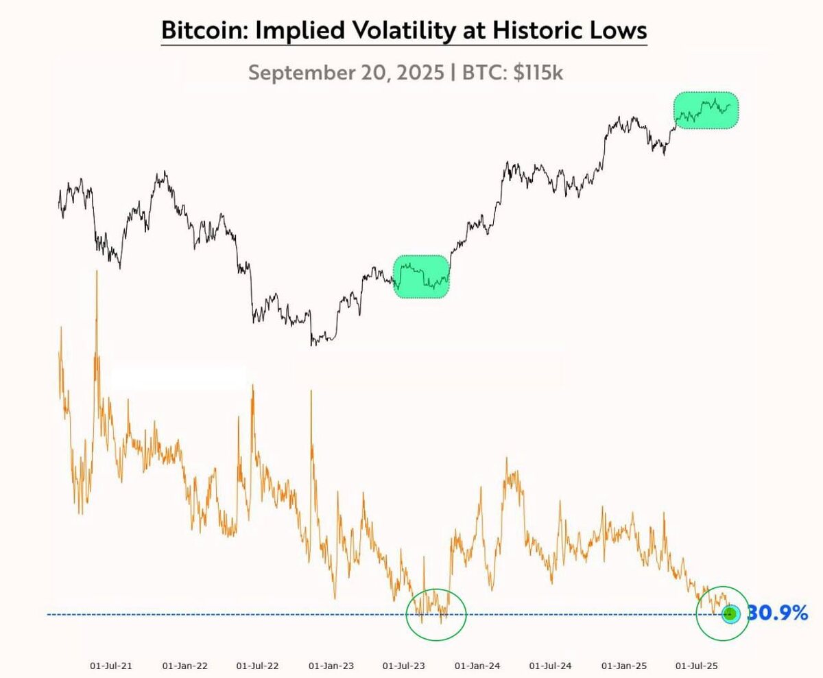 График checkonchain сигнализирует о том, что волатильность ВТС пришла в район исторических минимумов