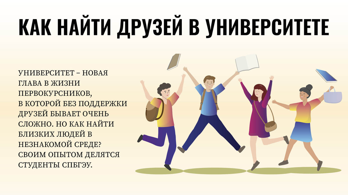 Университет – новая глава в жизни первокурсников, в которой без поддержки друзей бывает очень сложно. Но как найти близких людей в незнакомой среде? Своим опытом делятся студенты СПбГЭУ. Школа – это первая ступень социализации, куда попадаешь, будучи ребенком. А детям гораздо легче найти общий язык со сверстниками. В школе все стабильно: ты годами учишься с одними и теми же ребятами, знаешь, какие предметы у тебя будут, привыкаешь к системе обучения. В университете все иначе: ты сталкиваешься с новыми людьми, новыми предметами, новой системой обучения в целом. И на фоне страха неизвестности находить общий язык становится непросто. Татьяна Андреева, психолог СПбГЭУ: «Переход в университет – это значительный стресс. Хотя контактов здесь объективно больше, они часто остаются более поверхностными, функциональными – например, связаны только с учебой. Многие считают, что в школе найти друзей сложнее из-за подросткового кризиса: гипертрофированной значимости статуса, неуверенности в себе и вы