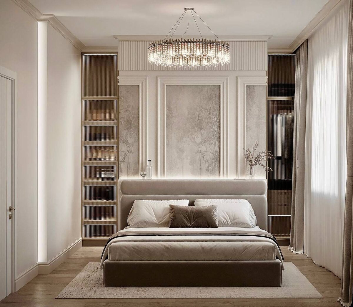 Интерьер спальни в частном доме с интересным зонированием гардеробной зоны #дизайнинтерьера