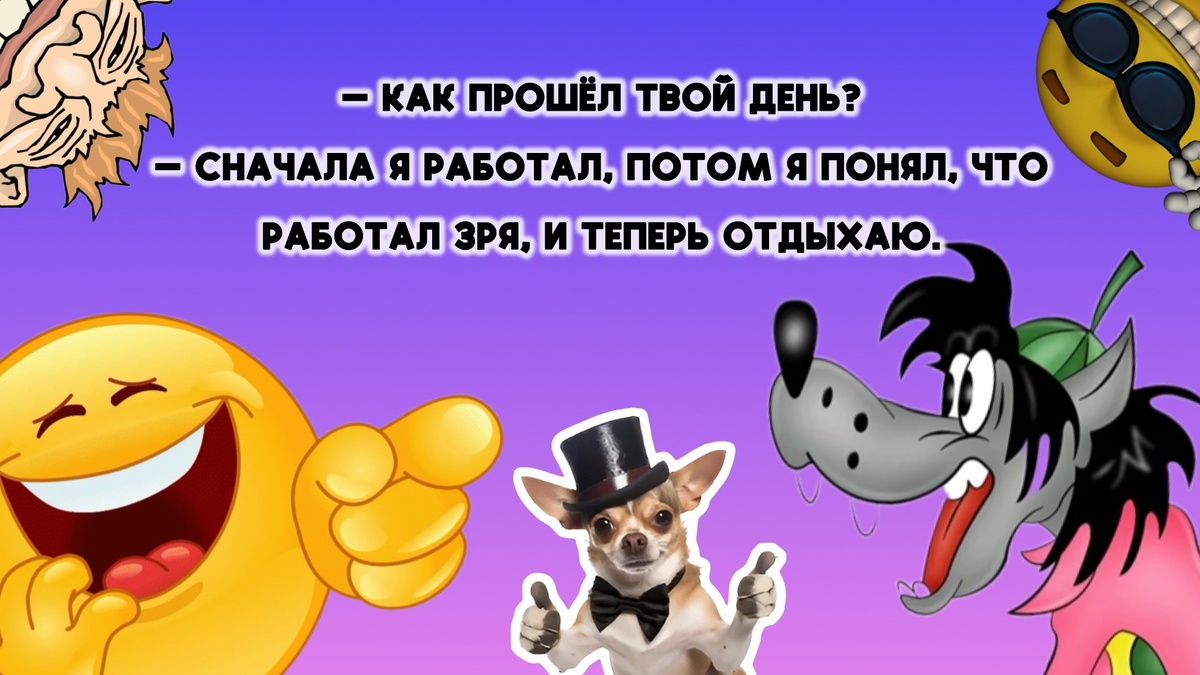 1 — Доктор, я всё время опаздываю. — Приходите завтра. 2 — У вас есть карты? — Есть, но без денег. 3 — Ты кто по профессии? — Специалист по отдыху. 4 — Почему у тебя плохое настроение? — Оно у меня пожизненное. 5 — Учитель: — Вовочка, сколько будет дважды два? — А для вас сколько надо? 6 — Ты спортом занимаешься? — Да, я кнопки на пульте жму. 7 — Доктор, у меня давление. — Ну и не давите! 8 — Пап, а ты умеешь готовить? — Конечно! Я умею звонить пиццерии. 9 — У тебя интернет работает? — Нет, я живу. 10 — Ты пьёшь лекарства? — Только когда вкусные.