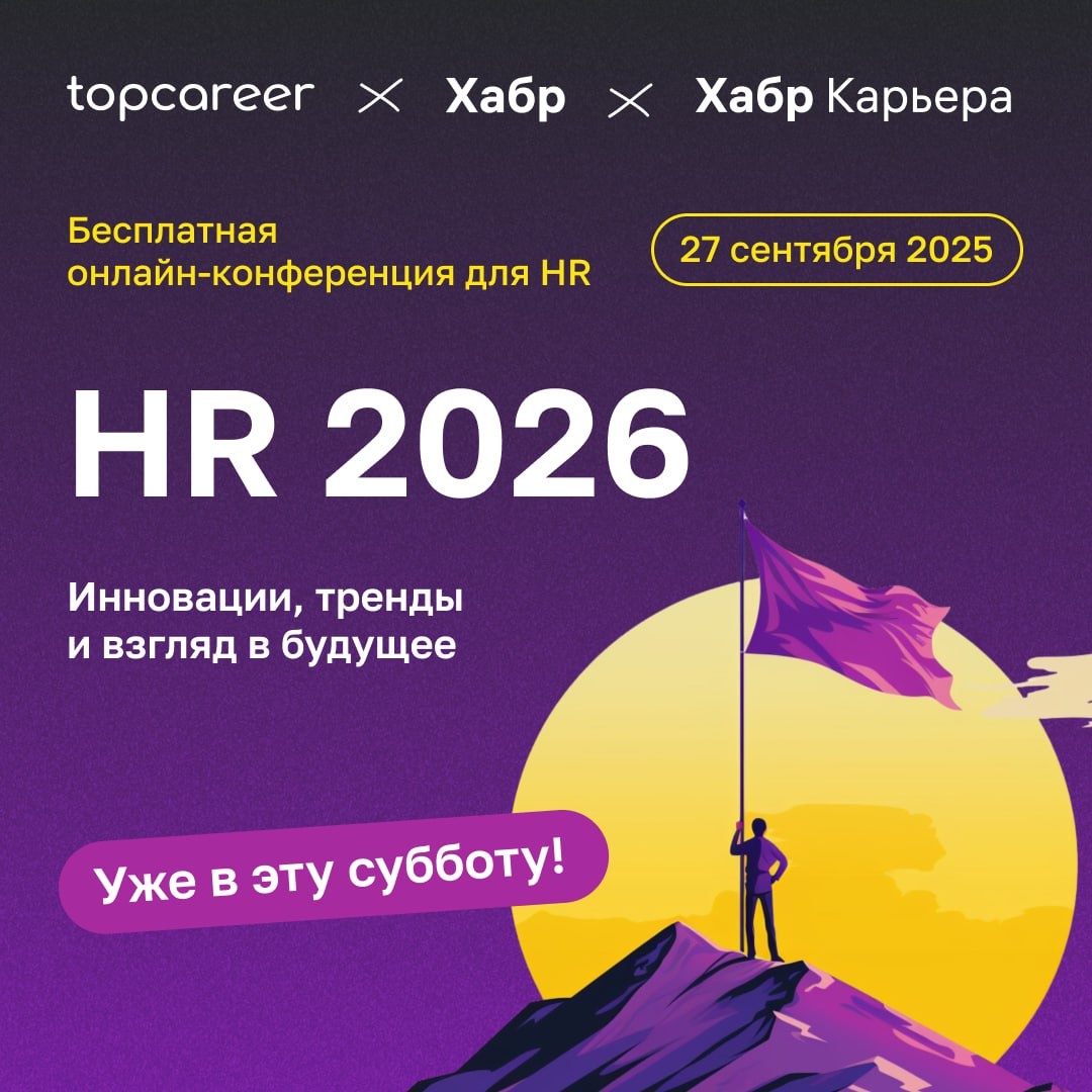 ❗️ Уже в эту субботу, 27 сентября в 11:00 мск стартует наша конференция «HR 2026: инновации, тренды и взгляд в будущее», которую мы проводим вместе с Хабр и Хабр.Карьера. Если еще не зарегистрировались, то скорее присоединяйтесь! Зачем? На конференции вместе с экспертами будем обсуждать: 🟣 как изменился HR за последнее время и какие подходы доказали свою эффективность; 🟣 как компании адаптировали оргструктуру, систему мотивации, обучение и развитие к новым реалиям; 🟣 как расти в профессии: что делать, чтобы не буксовать, а развиваться; 🟣 с какими вызовами стоит работать уже сейчас, чтобы иметь ориентир на 2026 год. ➡️ На специальном круглом столе обсудим, что делать малому и среднему бизнесу, если кандидатов переманивают крупные игроки с большими бюджетами. Среди спикеров конференции: ✨ руководители HR-направлений крупнейших российских компаний (Альфа-Банк, Хабр, ECCO East, Уралхим, СБЕР и др.); ✨ эксперты, которые видят тренды и применяют их на практике; ✨ партнеры и консульт