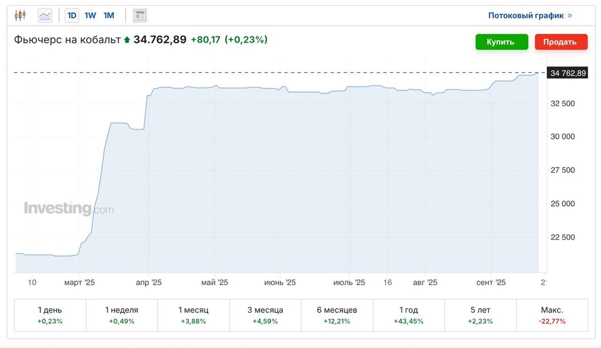 Демократическая Республика Конго отменит запрет на экспорт кобальта с 15 октября, но введёт экспортные квоты. Ввели запрет с 22 февраля этого года. Горнодобывающие компании смогут экспортировать чуть более 18 000 тонн металла до конца этого года и максимум по 96 600 тонн в 2026 и 2027 годах. Запрет и квоты, по мнению властей Конго, нужны для балансировки рынка и сохранения уровня цен. На ДРК приходится около трёх четвертей мирового производства кобальта. Динамику цен на металл видно на графике.