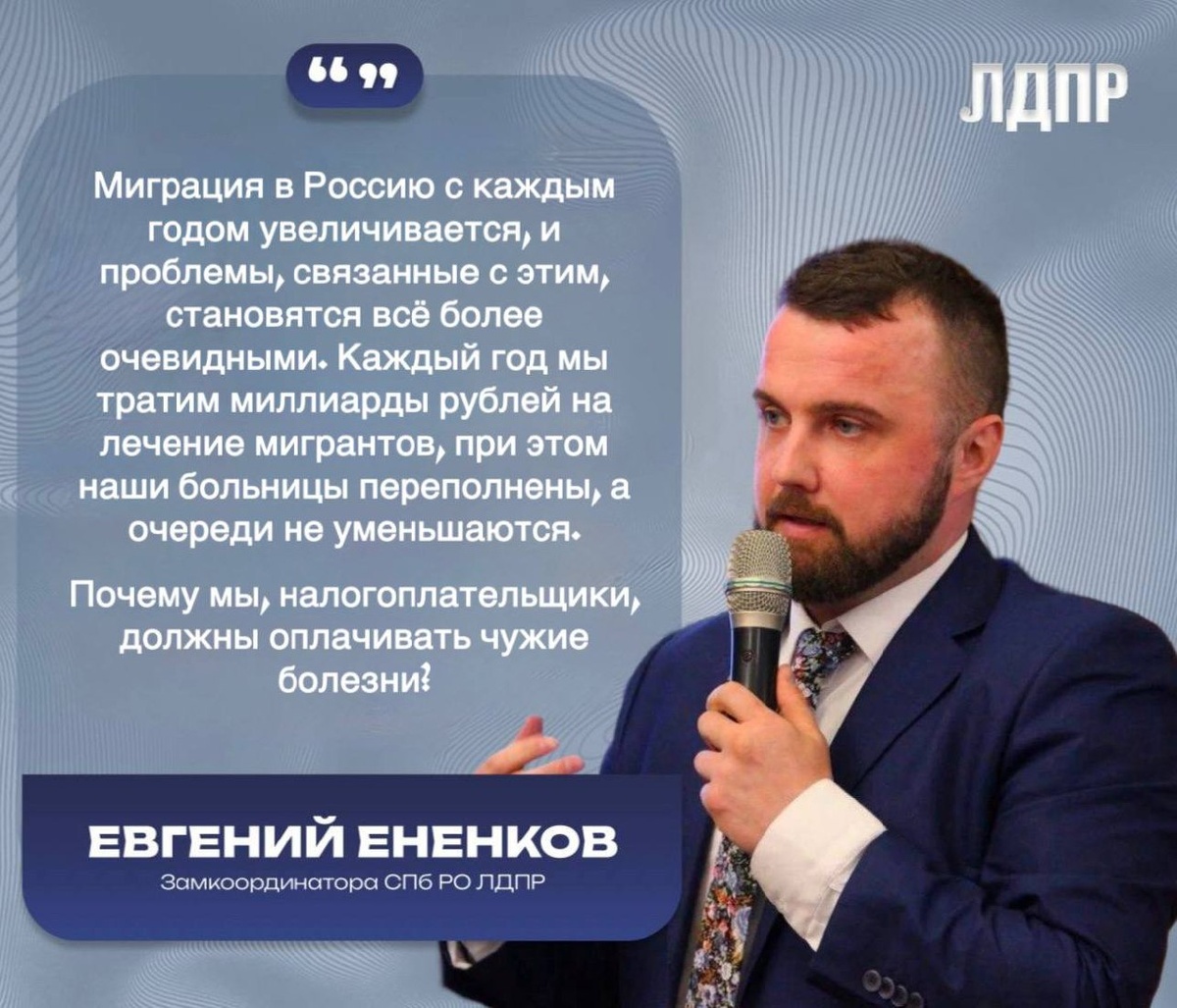 Мигранты должны платить за своё здоровье Миграция в Россию с каждым годом увеличивается, и проблемы, связанные с этим, становятся всё более очевидными. Каждый год мы тратим миллиарды рублей на лечение мигрантов, при этом наши больницы переполнены, а очереди не уменьшаются. Почему мы, налогоплательщики, должны оплачивать чужие болезни? Мы в ЛДПР предлагаем закон, который обяжет всех мигрантов иметь медицинскую страховку. Если у человека нет полиса - он будет выдворен из страны. Мигранты, которые приезжают сюда работать, должны обеспечивать себя медицинской помощью, а не рассчитывать на бюджетные деньги. Только за последние пять лет Россия потратила 60 миллиардов рублей на лечение иностранных граждан. При этом в страну ежегодно прибывают миллионы мигрантов, и кто может гарантировать, что все они здоровы? Мы не можем продолжать нагружать нашу систему здравоохранения, когда россияне не могут получить качественную помощь. Нам нужно думать о своих гражданах, а не об иностранных. Это спра
