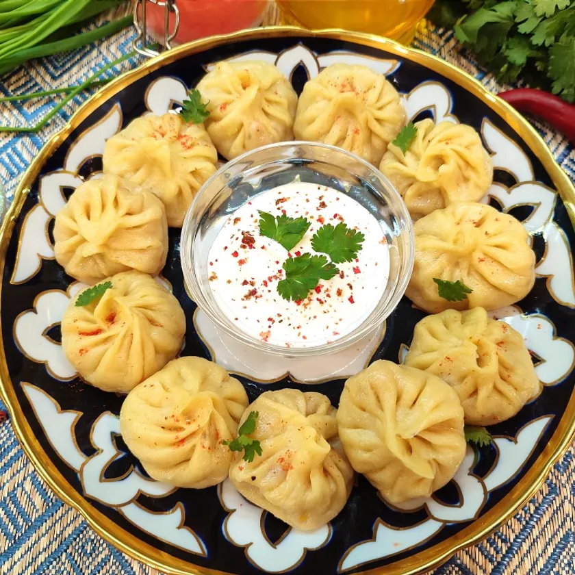 - Нотка свежести: Подайте к мантам свежие овощи — нарезанные помидоры, редис, листья салата или зелень (кинзу, укроп, зеленый лук). Это добавит блюду свежести и легкости.