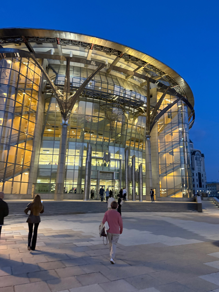 Вчера мы были в Международном доме музыки на концерте Владимира Спивакова и Национального филармонического оркестра России на открытии XXIII сезона Московского международного Дома музыки 21 сентября в Светлановском зале. Я обожаю Московский международный дом музыки, хотя некоторые считают его излишне пафосным. А как же иначе? Это же праздник, редкое событие в жизни каждого из нас, которое должно проходить в соответствующем антураже! Много белого, много света, много светлого дерева и мало тяжеловесного золота. Колонны укутаны прозрачной вуалью, под которой сияют гирлянды. Немножко прикалывает эта надпись, изначально предполагается, что сюда приходят воспитанные интеллигентные люди, но, видимо, администрация решила подстраховаться! Для любителей буфета сразу скажу: буфеты есть на каждом этаже, кроме балконного, меню без излишнего пафоса, ценнник высокий. Мы берем шампанское для большего погружения в праздничную атмосферу. Есть парковка прямо перед ступенями, 350 р/час, есть уличная