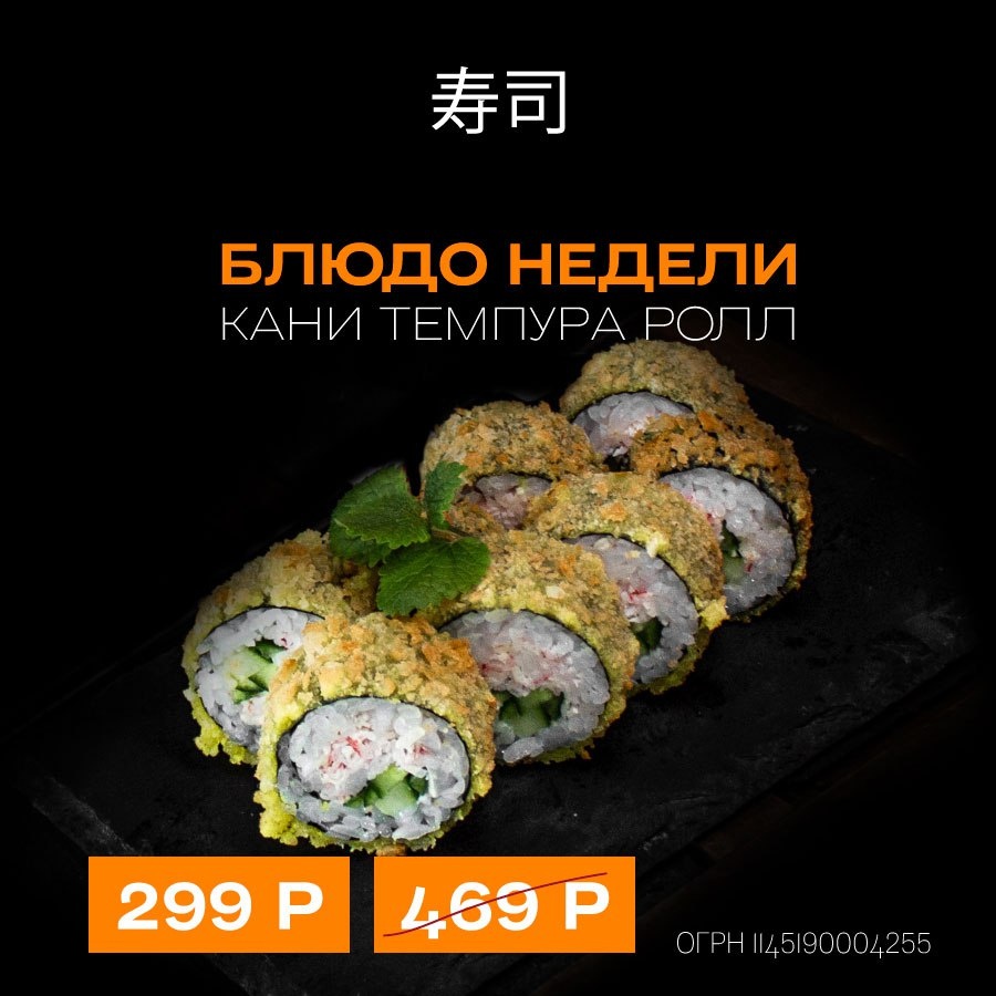 🔥 Акция недели! 🍣 Кани Темпура ролл теперь всего 299 ₽ вместо 469 ₽! 📌 В составе: рис, нори, снежный краб, свежий огурец, хрустящая темпура, соус унаги и кунжутный микс. 🥢 8 шт / 230 г — идеальная порция для удовольствия! ⚠️ Условия: -не более 1 позиции на чек и гостя; -не суммируется с другими скидками, бонусами и подарками; - акция действует с 22.09 по 28.09.2025. ✨ Лови момент и заказывай любимый ролл выгодно! • Адрес: Мурманск, Кольский пр., 152А • Телефон: +7 (8152) 202-202 • Сайт: sushishop51.ru