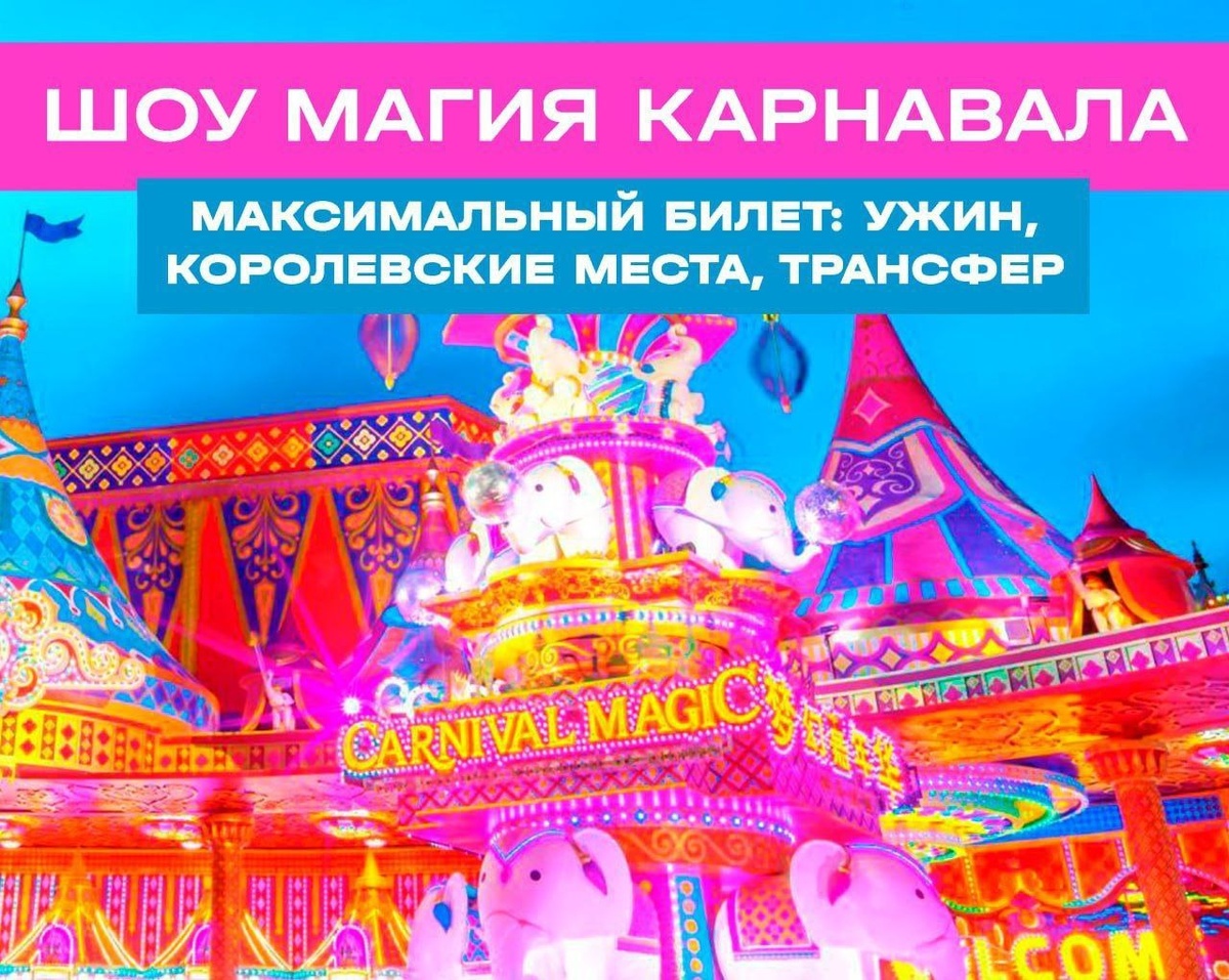 Таиланд. Пхукет. Тур №34 💖 ШОУ МАГИЯ КАРНАВАЛА (максимальный билет: ужин, королевские места, трансфер в обе стороны) 📝 Вишенка на торте ночных развлечений Пхукета, раскинувшаяся на площади более 40 акров, окутанная ослепительными огнями и сверкающими образами. Carnival Magic - первый тайский культурный карнавальный парк, воспевающий яркость и богатое культурное наследие, присущее многочисленным традиционным фестивалям, карнавалам и рыночным ярмаркам, которые расцветают во всем Королевстве. Вдохновленный экзотическими карнавальными празднованиями со всего мира, Carnival Magic представляет собой захватывающий вечер радостного празднования, величественного парадного шествия и культурного веселья, несравнимого ни с одним другим шоу на Земле. Отлично подходит для семейного отдыха. ⏱️ Длительность тура: 5-6 часов 📆 На выбор: пн/ср/сб в 17:30 Что включено: 📌 Трансфер в две стороны 📌 Королевские места 📌 Ужин в формате «шведский стол» 📌 Входной билет во все зоны парка Взрослый билет