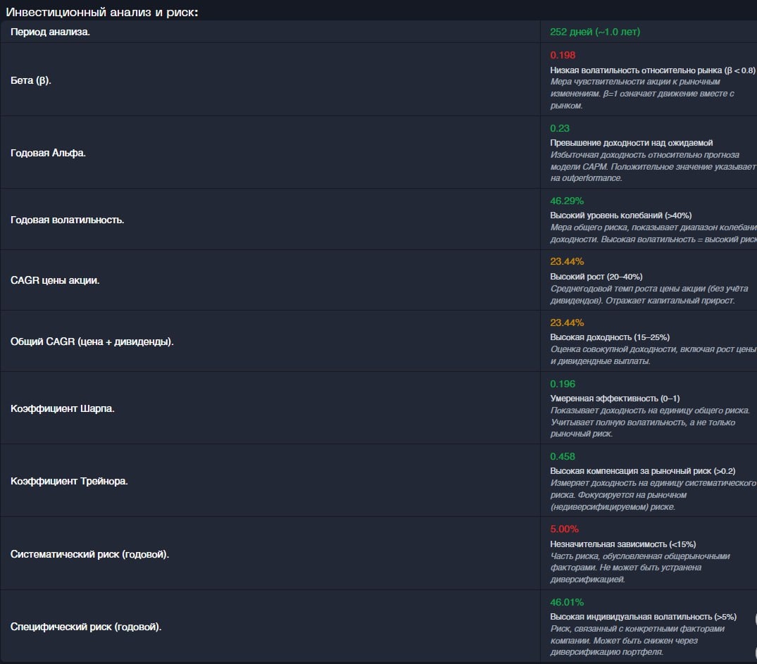 🚀 Инвестиционный анализ и риск: полный гид, как не проиграть - а понять, куда и зачем вы вкладываете! 📊 📌 Почему важно проводить анализ? Инвестиции — это не лотерея 🎲, а наука, построенная на данных, расчётах и понимании рисков. Мы создали новый раздел “Инвестиционный анализ и риск”, где каждый актив проходит глубокую диагностику за 252 торговых дня — это один год на бирже. 📆 Почему 252 дня? Это не случайное число — это количество торговых дней в году на большинстве бирж мира. Именно за этот период мы строим статистически значимую картину. 🔍 Глубокий разбор: 9 ключевых показателей инвестиционного анализа на примерах 1️⃣ Бета (β) = 0.198 Это мера того, насколько акция реагирует на движения рынка. 🔹 β = 0.8-1.2 — Акция движется синхронно с рынком. 🔹 β < 0.8 — Актив почти не реагирует на рынок. 🔹 β > 1.2 — Очень чувствителен к рынку. 2️⃣ Годовая Альфа = 0.23 Альфа — это “бонус сверх ожиданий”. 🔹 Альфа < 0 — Актив не оправдывает ожиданий. 🔹 Альфа = 0 — Актив работает “по пл