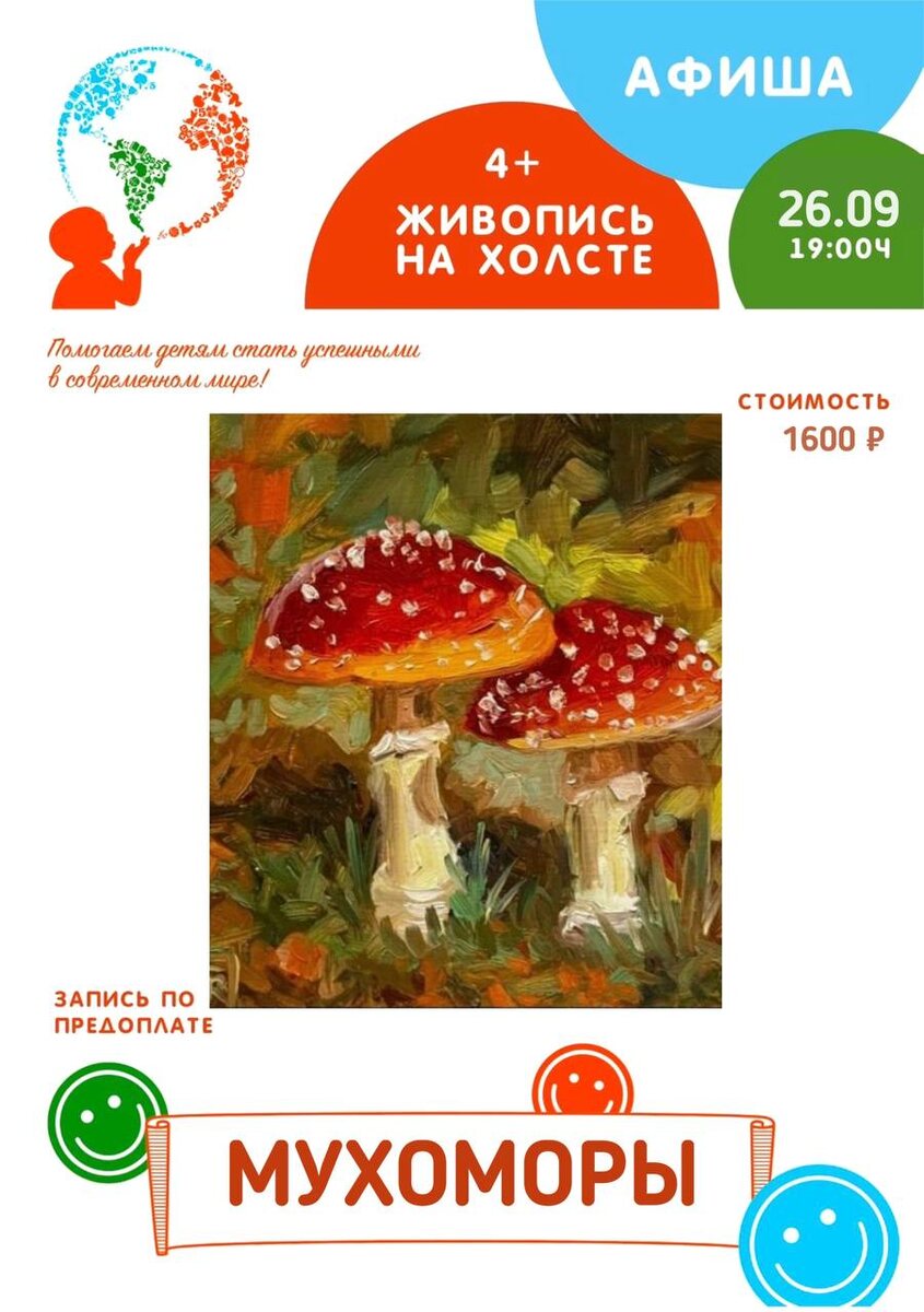 🤩🌟🌟🌟🌟🌟 мероприятий и мастер-классов на этой неделе! 🛎ОБЯЗАТЕЛЬНО ПЕРЕШЛИТЕ ПОДРУГЕ💜 ПЯТНИЦА: Мастер-класс по живописи для детей на холсте «МУХОМОРЫ» 🗓26 сентября ( пятница) 🕐19:00 Дети 4+ Стоимость 1600 ₽ 😀😀😀😀😀😀😀😀😀 СУББОТА: 🦋🌷Долгожданный кулинарный мастер-класс, готовим вкусняшки ОВСЯНОЕ ПЕЧЕНЬЕ С БАНАНОМ 🗓27 сентября(суббота) 🕐17:00 Дети 4+ Стоимость 1000₽ ‼️Количество мест на мероприятия ооочень ограничено‼️ Бронь и оплата по телефону: ☎️ +7-926-716-63-36 📍Кировоградская 36