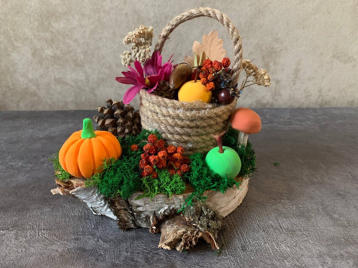 - Корзинка на берёзовом спиле – мини-корзинка из джутового шпагата наполнена дарами, а вокруг щедро «рассыпаны» (не без помощи клеевого пистолета, конечно) шишки, ягоды и листья.