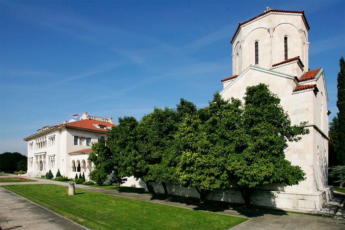 Королевский дворец Как и в Народную скупщину, в этот нео-палладианский дворец 1930-х годов постройки, расположенный в элитном районе Дединье, что к югу от города, попасть не так просто. Но в летнее время экскурсии изредка проводятся и здесь. Вам нужно только заранее написать в туристический совет и забронировать место. Ваши усилия будут вознаграждены, и вас даже доставят автобусом из мэрии прямо к Белому дворцу. Восхитительный интерьер дворца дополнен антикварной мебелью и картинами таких художников, как Пуссен, Веронезе, Каналетто, Брейгель, Тициан. Есть здесь также огромная библиотека, а с террасы открываются прекрасные панорамные виды. У посетителей дворца будет даже шанс увидеть наследного принца Александра и принцессу Кэтрин, если те окажутся дома. Проще говоря. Сербия