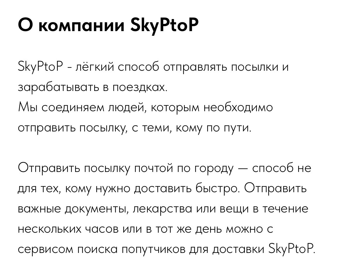 В современном мире скорость, простота и доверие — ключевые критерии при выборе сервиса доставки. SkyPtoP создан, чтобы сделать международную отправку посылок максимально удобной, прозрачной и безопасной. Наш сайт — https://skyptop.com/ — это не просто платформа, а полноценный цифровой помощник для всех, кто хочет быстро и с гарантией отправить вещи, документы или подарки в любую точку мира. Удобство начинается с сайта Интерфейс SkyPtoP разработан с учётом потребностей пользователей: он интуитивно понятен, лаконичен и работает без задержек. Независимо от того, являетесь ли вы отправителем или путешественником, желающим подзаработать, вы найдёте на сайте всё необходимое за несколько кликов. 🔹 Простая подача заявки Хотите отправить посылку? Заполните короткую форму на главной странице: Укажите пункт отправления и назначения, Вес и габариты посылки, Желаемую дату доставки, Контактные данные. После отправки заявки наш менеджер свяжется с вами в течение 15 минут — ответит на вопросы, у