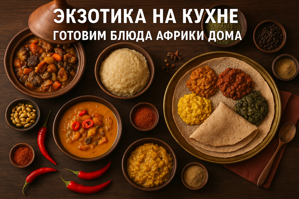 Африка — континент, где кухня столь же разнообразна, как и её пейзажи. Здесь пески Сахары встречаются с океанскими волнами, а древние традиции племён соседствуют с яркими мегаполисами. Но главное — Африка умеет удивлять вкусами. Каждый регион предлагает свой кулинарный язык, свою историю, свою палитру ароматов. Сегодня я хочу показать вам, что африканскую кухню можно готовить дома. Да, прямо у вас на кухне можно создать атмосферу жаркого Марракеша, эфиопского рынка специй или уютной деревни в Кении. И самое приятное — для этого не нужны экзотические навыки, только желание и любопытство. Если бы блюда умели рассказывать сказки, то таджин был бы восточной легендой. Это рагу из мяса и овощей готовится медленно, в глиняном горшке, под крышкой необычной формы. Благодаря специям — кориандру, корице, имбирю — весь дом наполняется волшебным ароматом. И когда вы открываете крышку, кажется, что оказываешься посреди марокканского базара. Совет: попробуйте добавить к мясу курагу или изюм. Сладкие