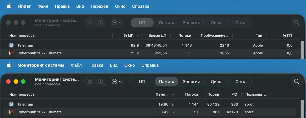 Cyberpunk 2077 vs Telegram Интересный факт: в простое Cyberpunk полностью сливает Telegram по потреблению CPU и RAM. А ваш ноутбук потянет телегу с расходом 20 гигабайт оперативной памяти…? Решил взглянуть, как Cyberpunk бегает на ARM MacBook с процессорами M, но, как мне кажется, нашёл баг в телеге. Печалит одно, у телеги нет поддержки и сообщить о нём некуда… Полезные ссылки, чтобы попытаться найти "поддержку": https://bugs.telegram.org/ https://github.com/telegramdesktop/tdesktop https://github.com/overtake/TelegramSwift