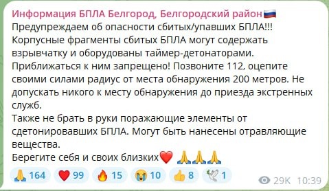 Обломки дронов могут быть взрывоопасны Фрагменты сбитых беспилотников часто содержат взрывчатку с таймером и могут быть обработаны отравляющими веществами. Приближаться к обломкам запрещено! При их обнаружении, необходимо позвонить 112 и огородить опасную зону в 200 метров, напоминают мониторинговые каналы. Как вести себя при атаке БПЛА – здесь. Мы на связи в MAX Подписаться на нас|Предложить новость