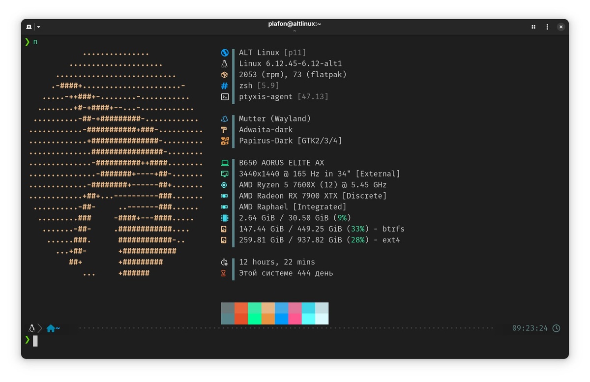 ~ 444 дня рабочей станции! Просто захотел поделиться) Куча успешных апдейтов и даже полная замена железа и платформы с AM4 на AM5, а оно всё работает) Даже жалко будет, если оно упадёт когда-то! UPD: Я если что сделал страничку со всеми спеками моих железок в ALT Zero https://plafon.gitbook.io/alt-zero/start/plafonpc @plafon #ОСАльт