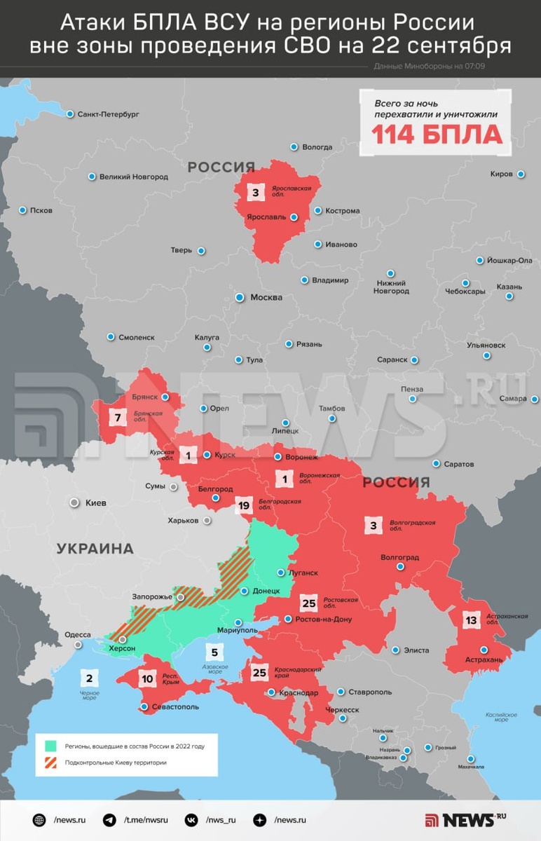 114 беспилотников сбили над регионами РФ силы ПВО, сообщили в Минобороны. По 25 дронов сбили в Ростовской области и Краснодарском крае, 19 — в Белгородской области, 13 — в Астраханской, 10 — в Крыму, семь — в Брянской области, пять — над акваторией Азовского моря, по три — в Ярославской и Волгоградской областях, два — над акваторией Чёрного моря, еще по одному — в Курской и Воронежской областях. При атаке на Крым погибли три человека, еще 16 пострадали. ⭕️ Подписаться | Мы в MAX | Буст