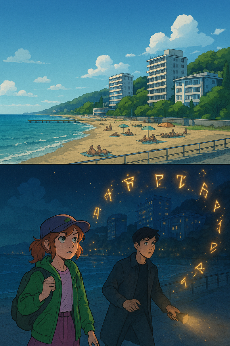 Глава IV. Путь в Сочи Дневник вёл её всё дальше. Символы складывались в карту. Следующая точка была в Сочи. Поездка выглядела обычной: море, пальмы, Олимпийский парк. Но ночью всё менялось. Линии стадионов превращались в светящиеся круги, по которым текло время. В горах открывались порталы, ведущие в прошлое и будущее. Алиса и её друг Нико спустились в одну из таких пещер. Под сводами сиял артефакт — каменный механизм с вращающимися кольцами, словно гигантские часы. Он пульсировал светом, и каждый удар отзывался в сердце. Глава V. Игра времени Но они были не одни. Игроки вечности окружили их. Их лидер вышел вперёд — тот самый человек с глазами-часами.
