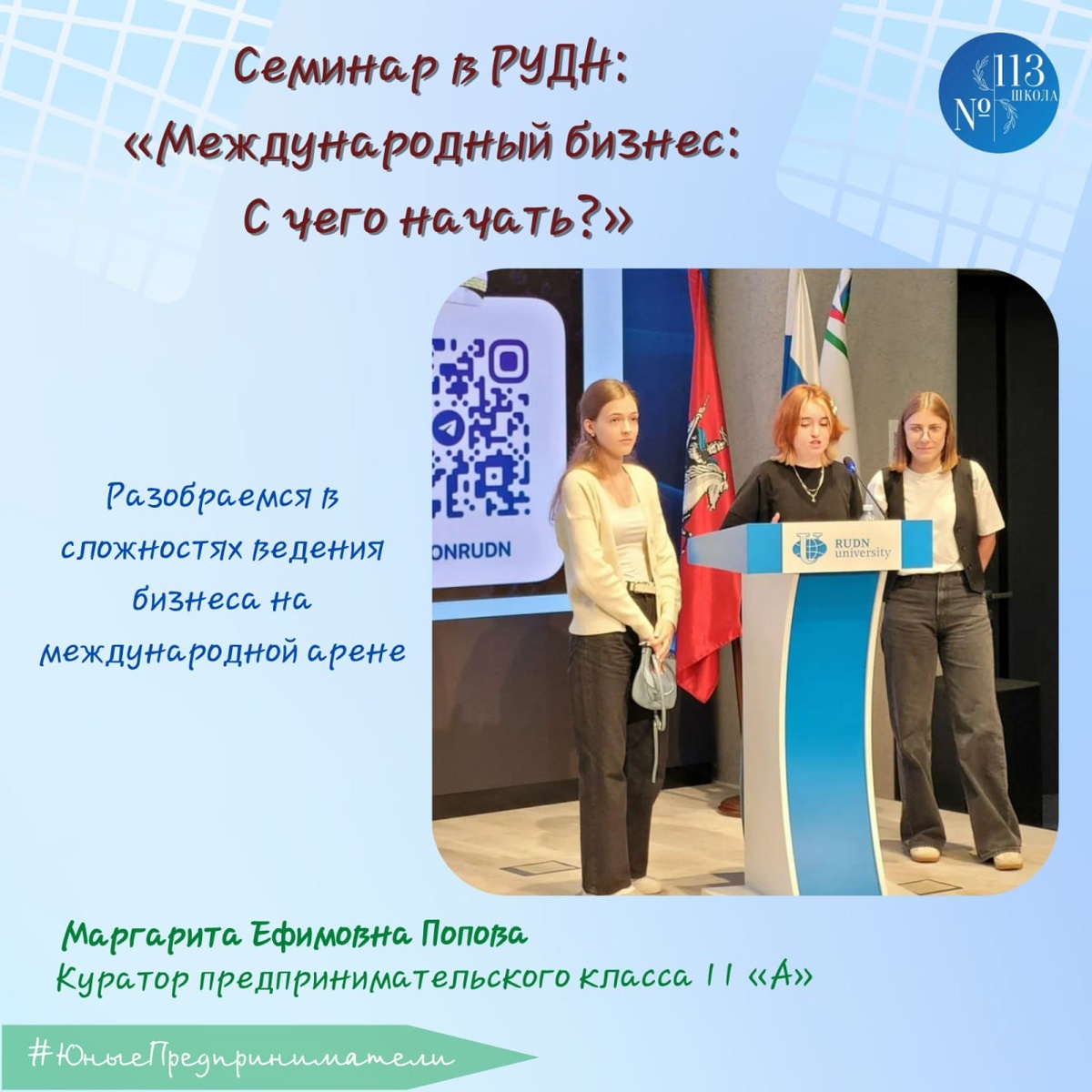 👩🏼💼Как российским школьникам понять тонкости международного бизнеса в условиях санкций? Ответ нашли на бизнес-семинаре «Международный бизнес: С чего начать?» в РУДН. 💼Ученики 11 «А» класса получили уникальную возможность разобраться в сложностях ведения бизнеса на международной арене, несмотря на текущие ограничения. Семинар, организованный на экономическом факультете ФГАОУ ВО «Российский университет дружбы народов», стал настоящим погружением в мир глобальной торговли. 🗯Куратор класса, Маргарита Ефимовна Попова, поделилась впечатлениями от мероприятия, подчеркнув его актуальность и практическую направленность. В рамках семинара школьники не только узнали о том, как преодолевать санкционные барьеры и поддерживать торговые отношения с европейскими и американскими партнерами, но и получили ценные знания о налаживании новых деловых связей со странами БРИКС. 💻Программа семинара была тщательно продумана и включала две ключевые части: теоретическую и интерактивную. 💱В первой поло