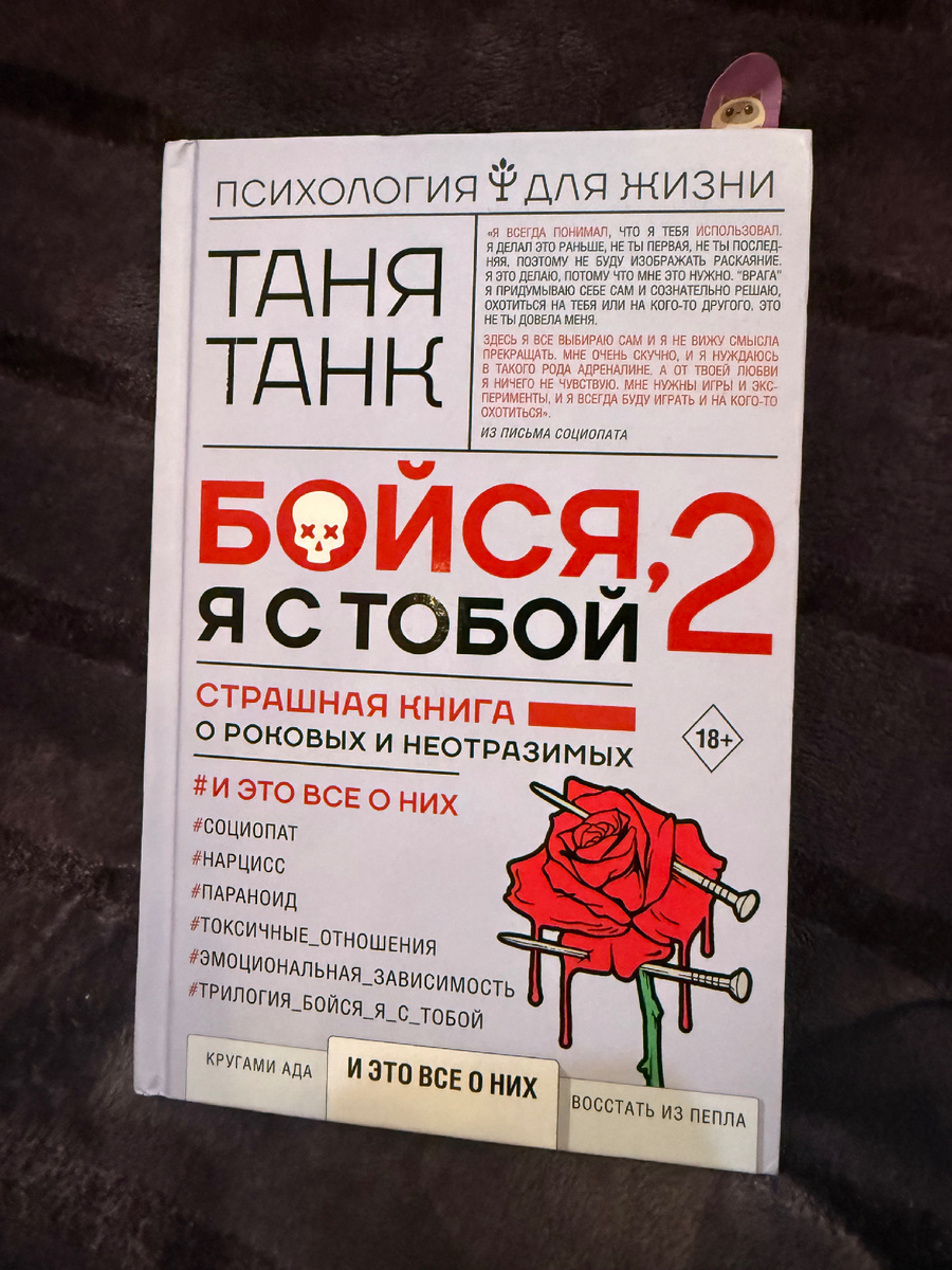 Про книги Тани Танк я знала из отзывов на тематических сайтах, из комментариев под статьями психологов, а недавно я купила их и начала читать. Делюсь впечатлениями. Всего в комплекте 5 книг: трилогия ‘Бойся, я с тобой’, ‘В постели с абьюзером’ и ‘Моя токсичная семья’. Я купила все 5 книг, но прочитала пока только 3, это не легкое чтиво для досуга, а книги, заставляющие много думать и анализировать, пересматривать свои убеждения и отношение к многим привычным вещам. Данные книги об изнанке отношений, их цель - предоставить как можно больше информации, чтобы предостеречь, предупредить и по возможности помочь тем, кто уже оказался в плену абьюза. Увы, но от шанса оказаться в деструктивных отношениях не застрахован никто: будь то юная неопытная девушка или умудренная жизнью женщина. В период влюбленности зрение сильно искажено розовыми очками, потому сложно отличить границу, за которой забота превращается в тотальный контроль, а близкие отношения в насилие. Титаническую работу проделала ав