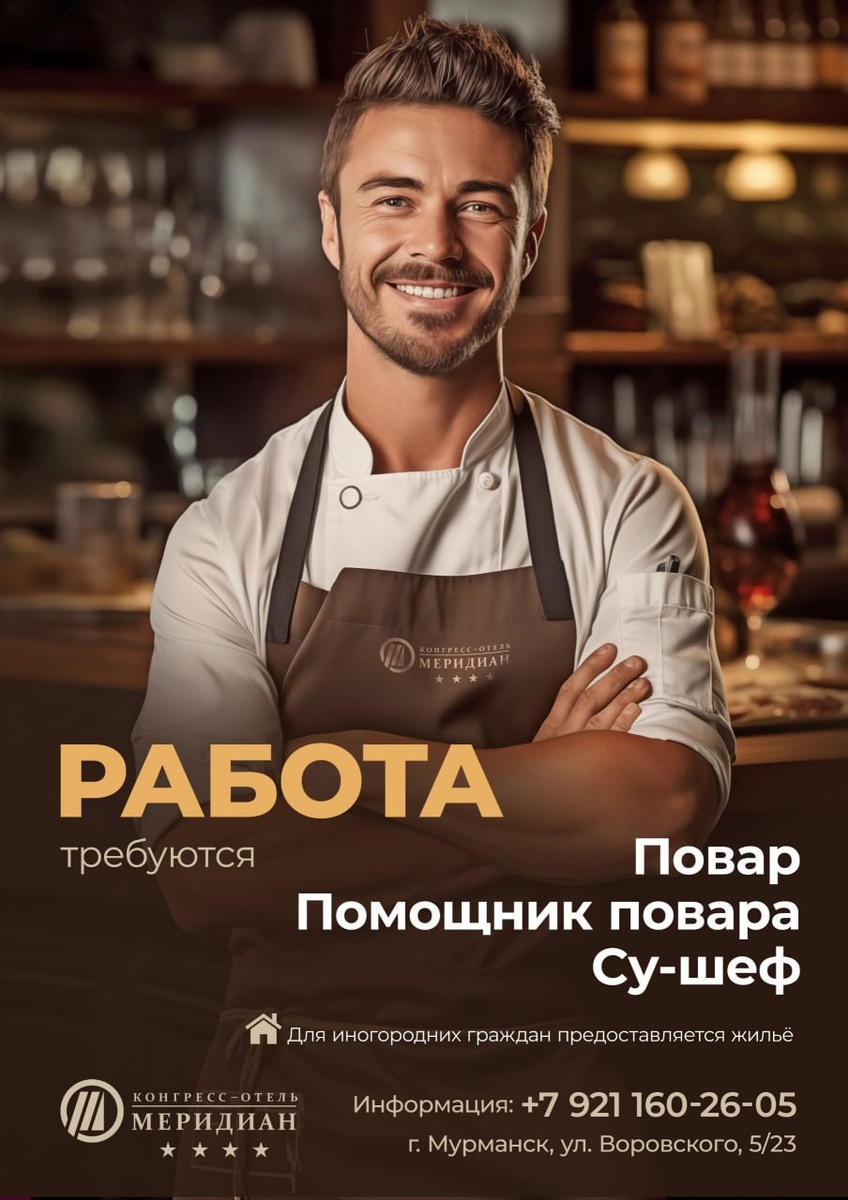 ⭐ Вы любите готовить и готовите с душой? Трудолюбивы и считаете свою профессию настоящим призванием? Конгресс-отель «Меридиан» в дружную команду ищет повара, помощника повара и су-шефа! Мы предлагаем: • Оплачиваемый отпуск – 52 дня в году • Бесплатное питание • Гибкий график работы • Достойную и своевременную заработная плата Подробности по телефону: +7 (921) 160-26-05 Присоединяйтесь – давайте готовить не просто еду, а настоящее искусство! #работаМурманск #вакансииМурманск #поварМурманск #кулинарияМурманск #выпечкаМурманск