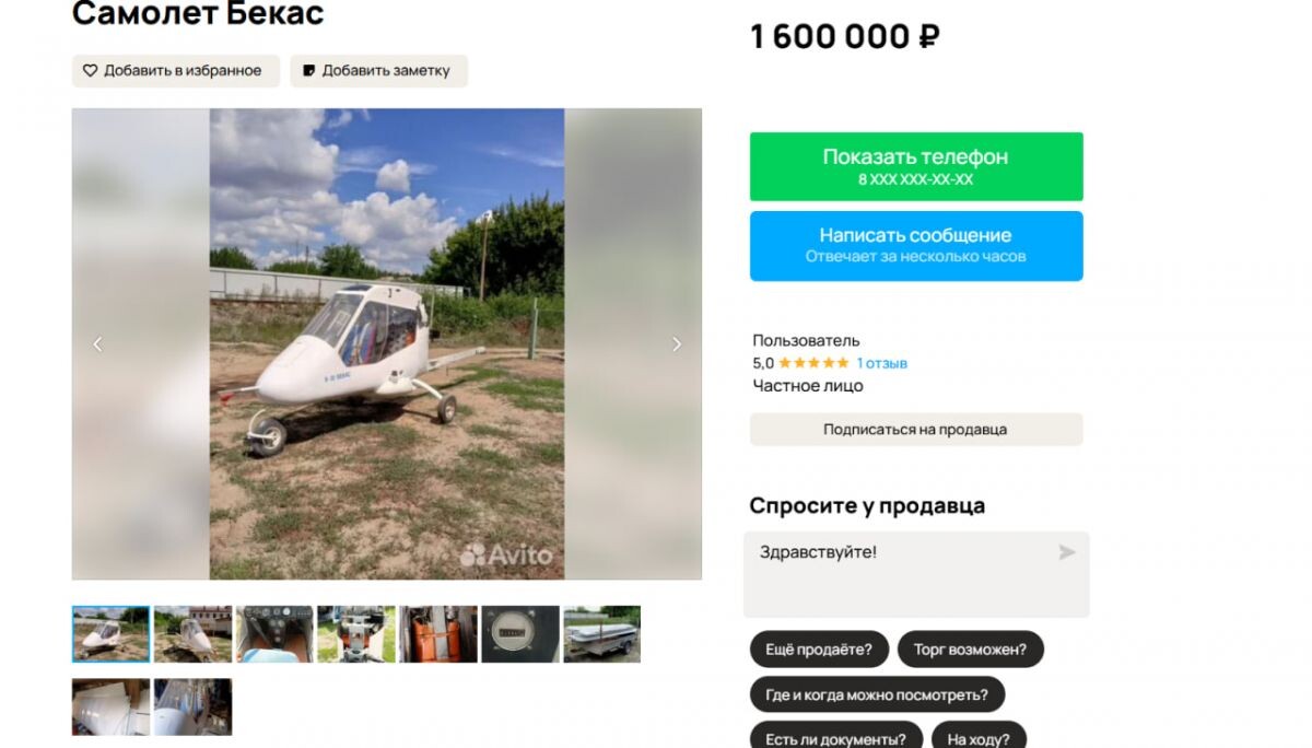Многоцелевой самолет "Бекас" продают за 1,6 млн рублей в Воронеже