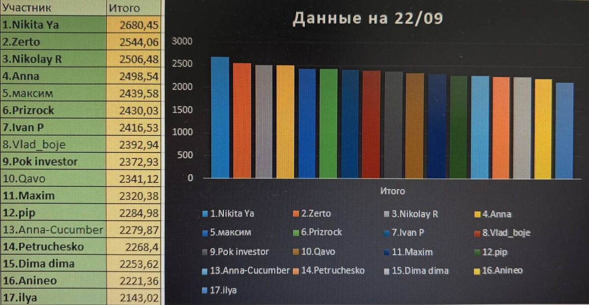 Подводим предварительно итог по игре. Из 17 участников 4 не сдали свои задания и сегодня я продал из их портфелей 2 самые дорогие карты. В общем зачете они все-равно участвуют с кэшем на руках и остатком по картам. Было интересно наблюдать по тактикам на этот этап. Кто-то решил переложиться в силд, кто-то набрал разных карт, а кто-то решил поставить оллин на конкретную карту. Тем интересней будет итог. Данные на 22.09 можно увидеть в табличке